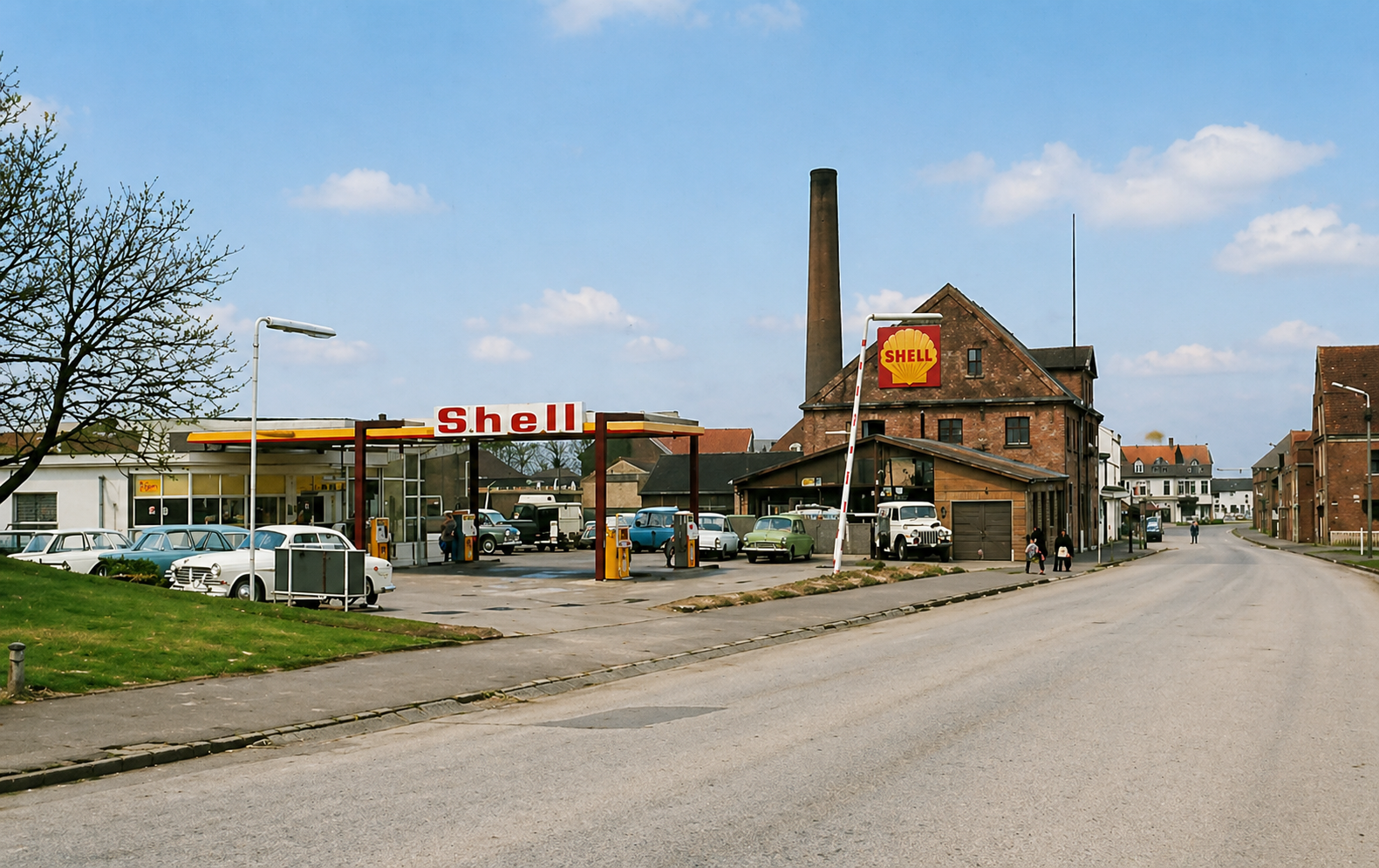 Billede af Shell i Bredgade formentlig i 70erne. NO Godballe, Lokalhistorie gruppe på Facebook. Farvelagt af AI.